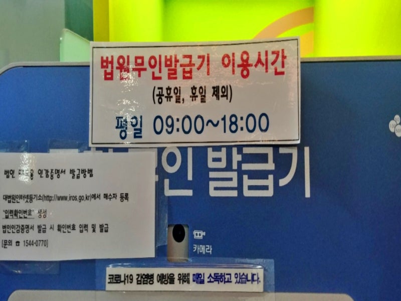 민원통합발급기의 근무시간은 주말 및 공휴일을 제외한 평일 오전 9시부터 오후 6시까지입니다.서류는 법인등기부등본, 법인인감증명서, 부동산등기부등본 등 3종류가 있으며 수수료는 1매당 1,000원입니다.