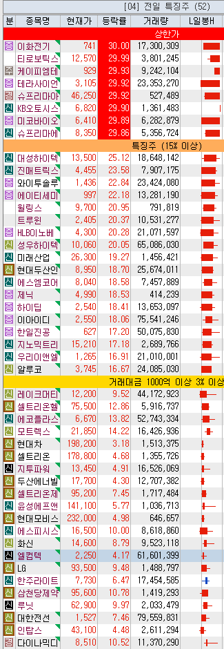 거래액이 1,000억원을 초과하는 기타 특성주~처럼 레이크머티리얼즈, 셀트리온헬스케어, 에코 플라스틱모트렉스, 현대자동차, 셀트리온, 지투파워, 두산에너지, 셀트리온제약, 윤성F&C, 현대모비스, 에스피시스템, 화신, 엘컴텍, LG, 한주경, 삼천당제약, 루닛, 대한전선, 인탑스, 다이나믹디자인 .