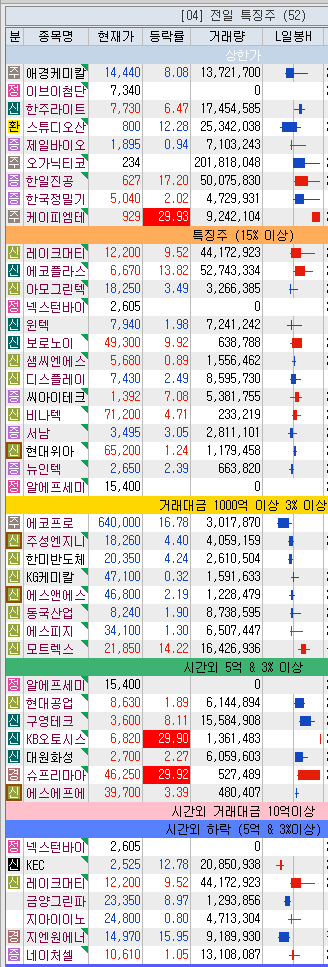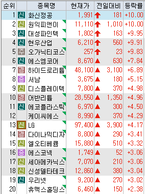 오늘의 시간 외 특집 주간5억원 이상 3% 상승한 종목 화신정공(10.00%), 원익P&E (10.00%), 대성화인텍(9.95%), 현우산업(9.91%), 유기농 차 화장품(9.83%), smcore(7.84%), 하이드로리튬(6.89%), 남서(5.15%), 디스플레이테크(4.98%), 어반리튬(4.96%), 에코 플라스틱(4.50%), 관세청(4.29%), 엘지(4.17%), 역동적인 디자인(3.41%), 로티베툼(3.32%), 에스코넥(3.06%), 세아메카닉스(3.06%), 신성델타텍(3.04%), 우리의 그물(3.02%) 안돼.