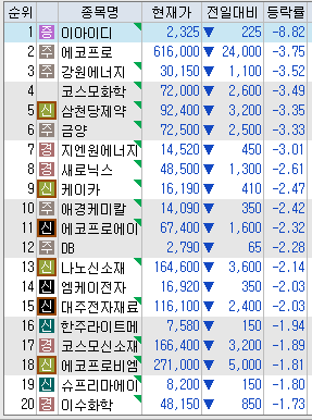 오늘 시간 외 약세 아이템으로는 EID(-8.82%), 에코 프로 (-3.75%), 강원에너지(-3.52%)코스모케미칼(-3.49%), 삼천당제약(-3.35%), 금양(-3.33%), 지앤원에너지(-3.01%), 사로닉스(-2.61%) 안돼.