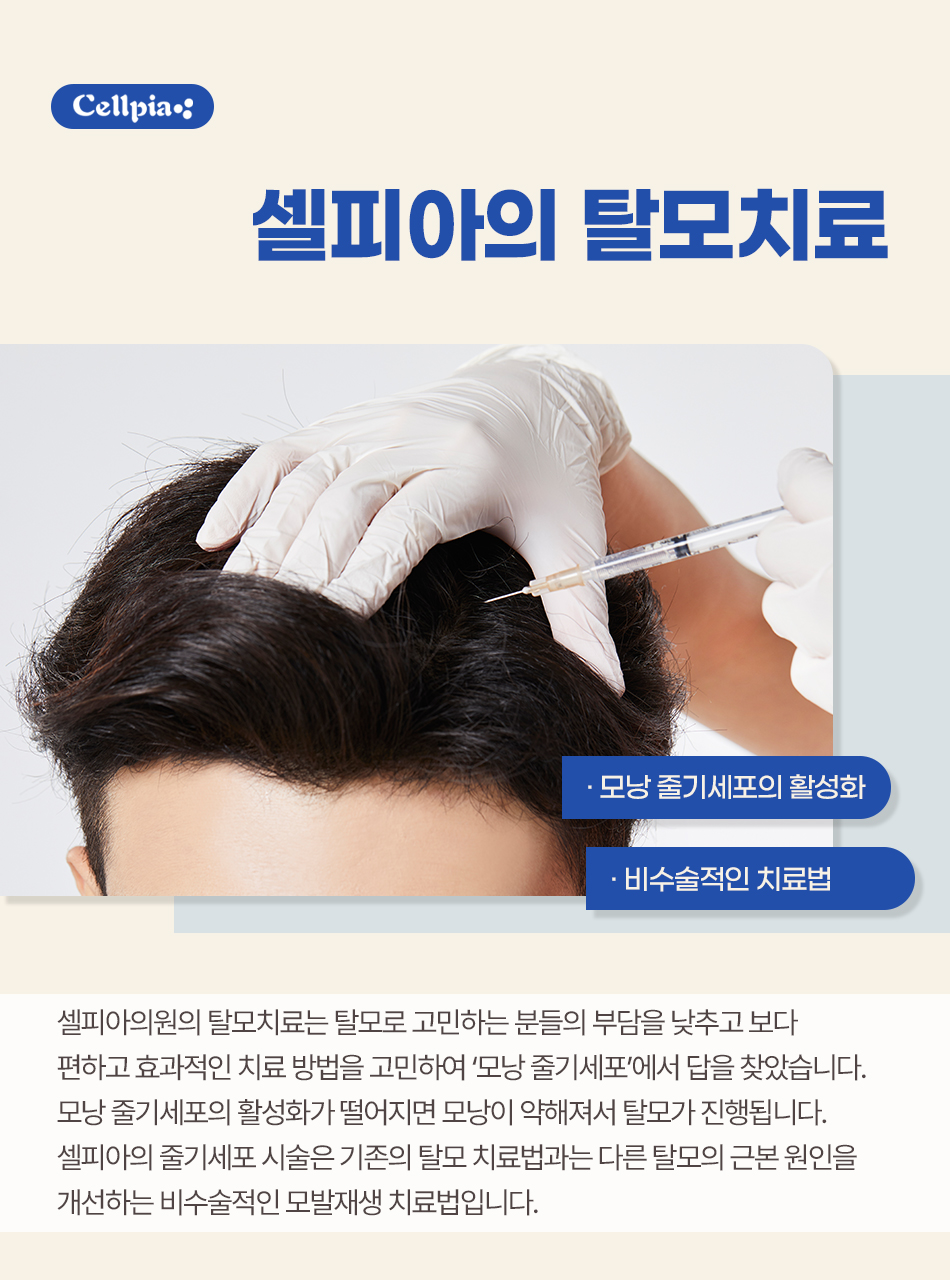 조직 재생을 돕는 줄기세포를 환부에 주입해 손상된 혈관을 재생하고 피하 콜라겐 생성을 활성화하기 때문에 줄기세포 치료로 탈모 개선이 기대된다.